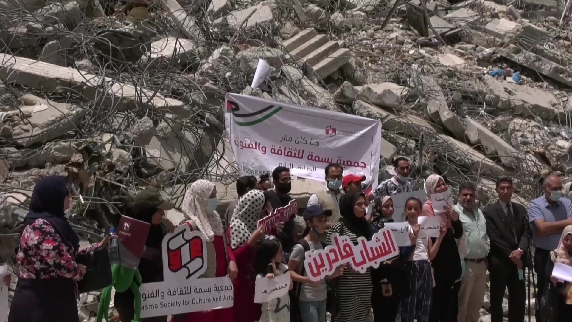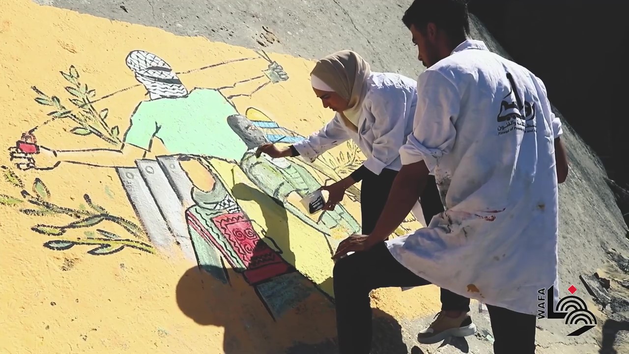 رسم جدارية على أنقاض برج دمره الاحتلال بغزة