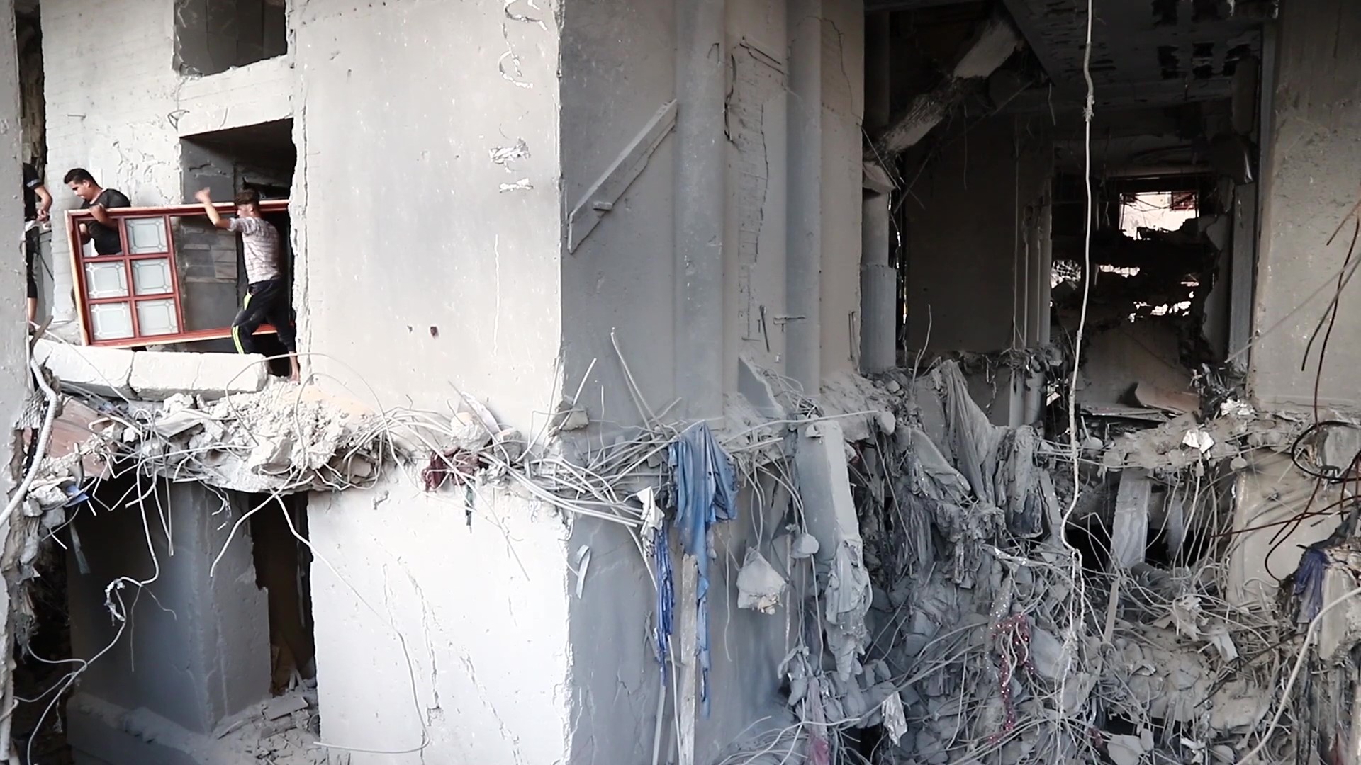 مواطنون يجمعون أشياءهم من برج مدمر في غزة