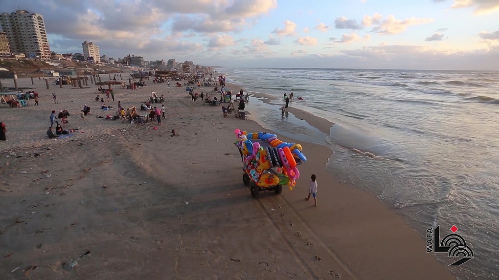 مواطنون في مقهى دمره الاحتلال على شاطئ غزة