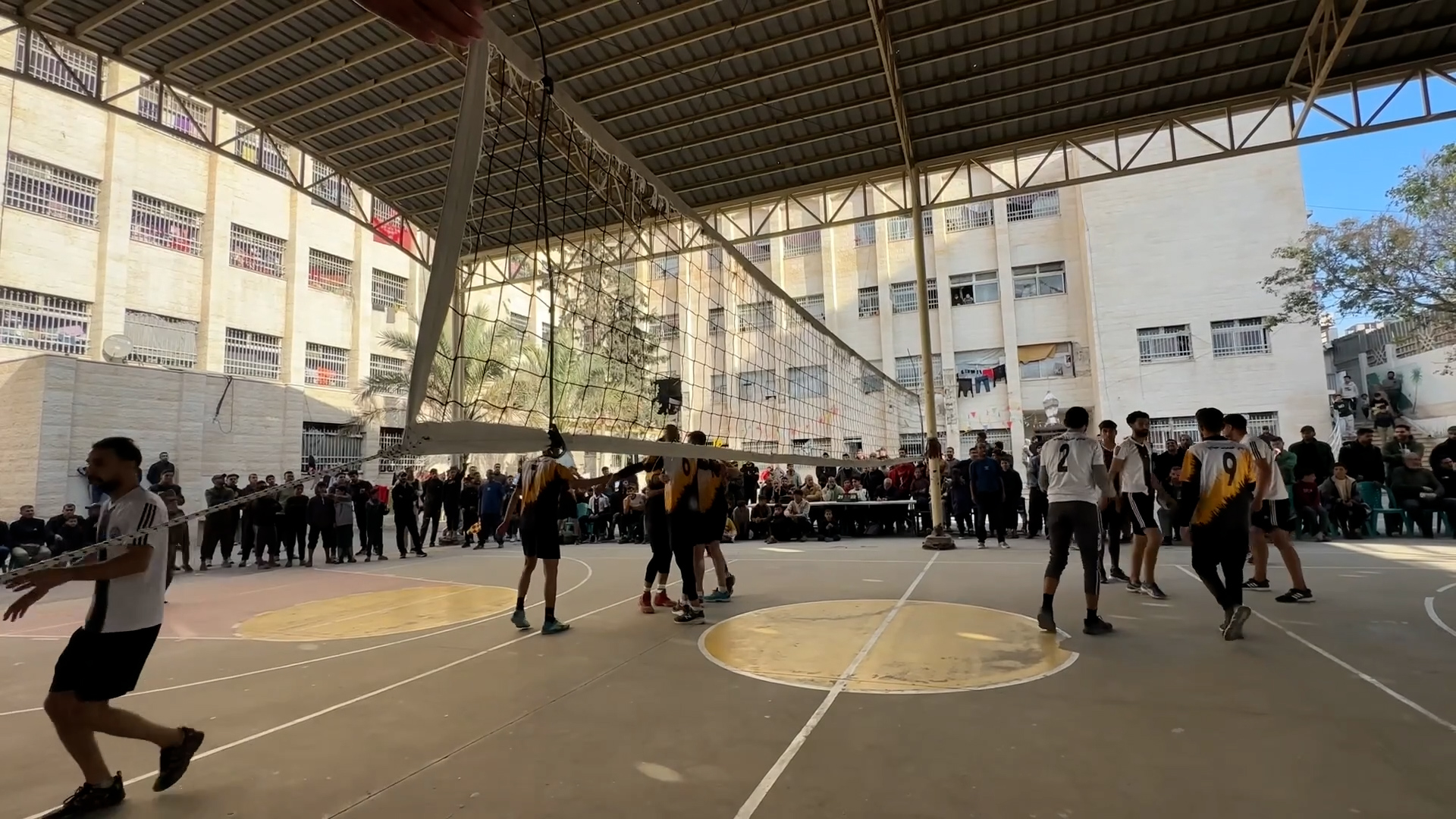 نازحون يلعبون الكرة الطائرة داخل مركز إيواء بغزة