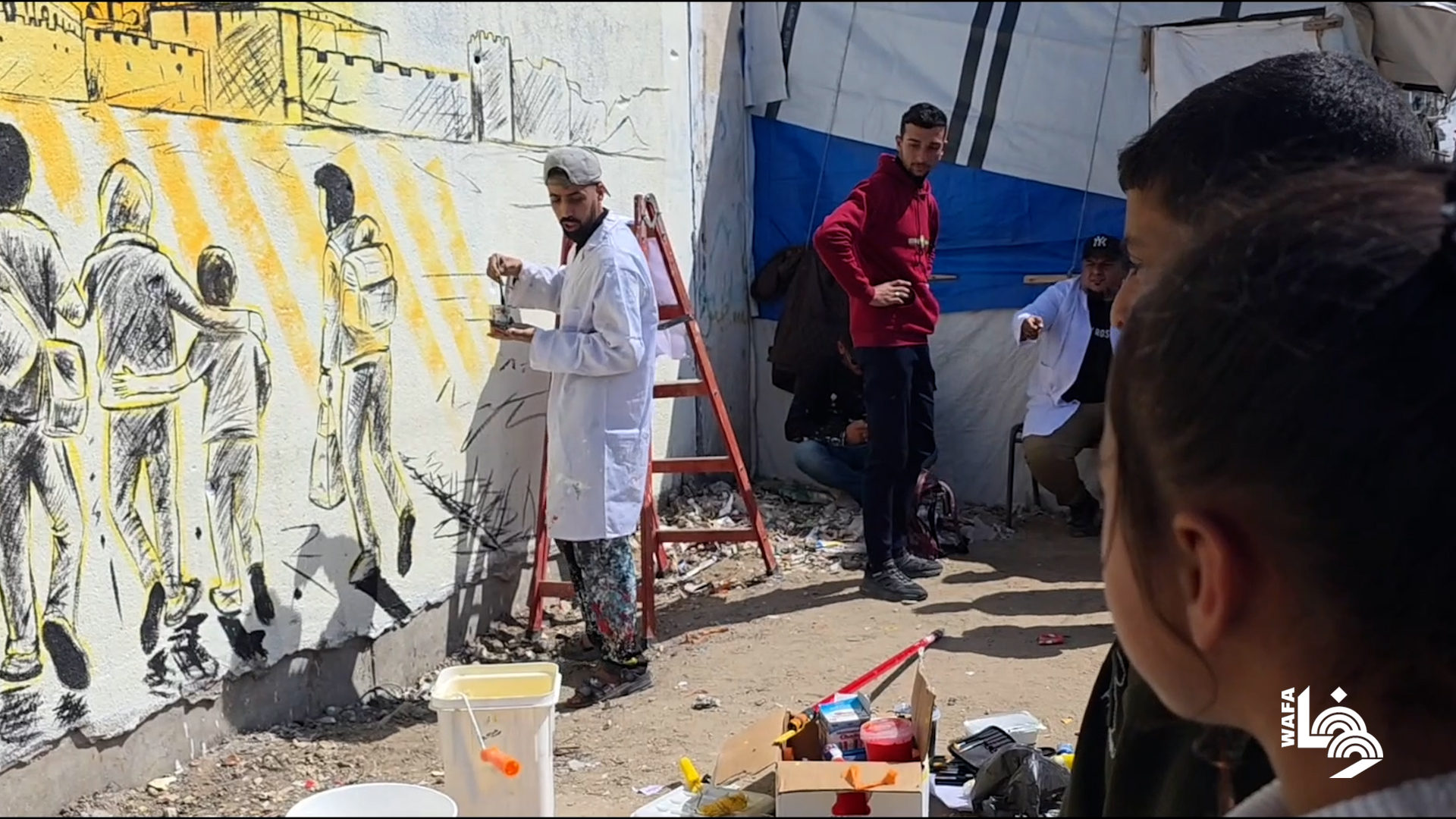 فنانون يرسمون جداريات في مأوى نازحين بغزة