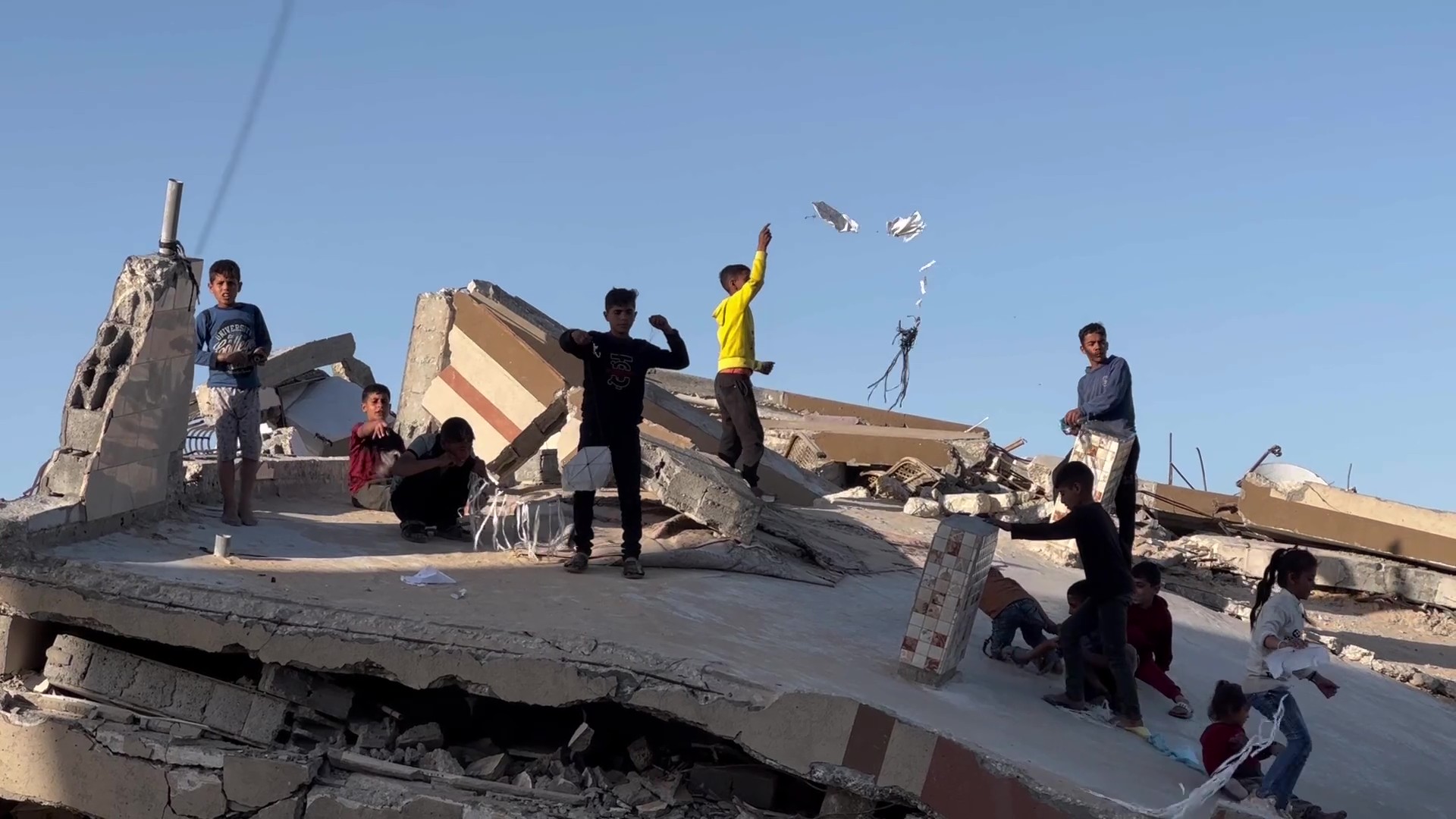 أطفال يلهون عند أنقاض المنازل المدمرة في جباليا