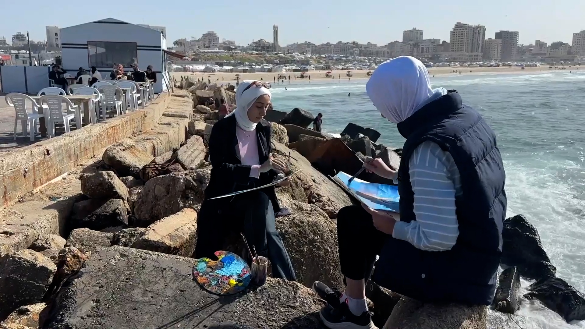 شابات ينظمن نشاطاً للرسم على ساحل غزة