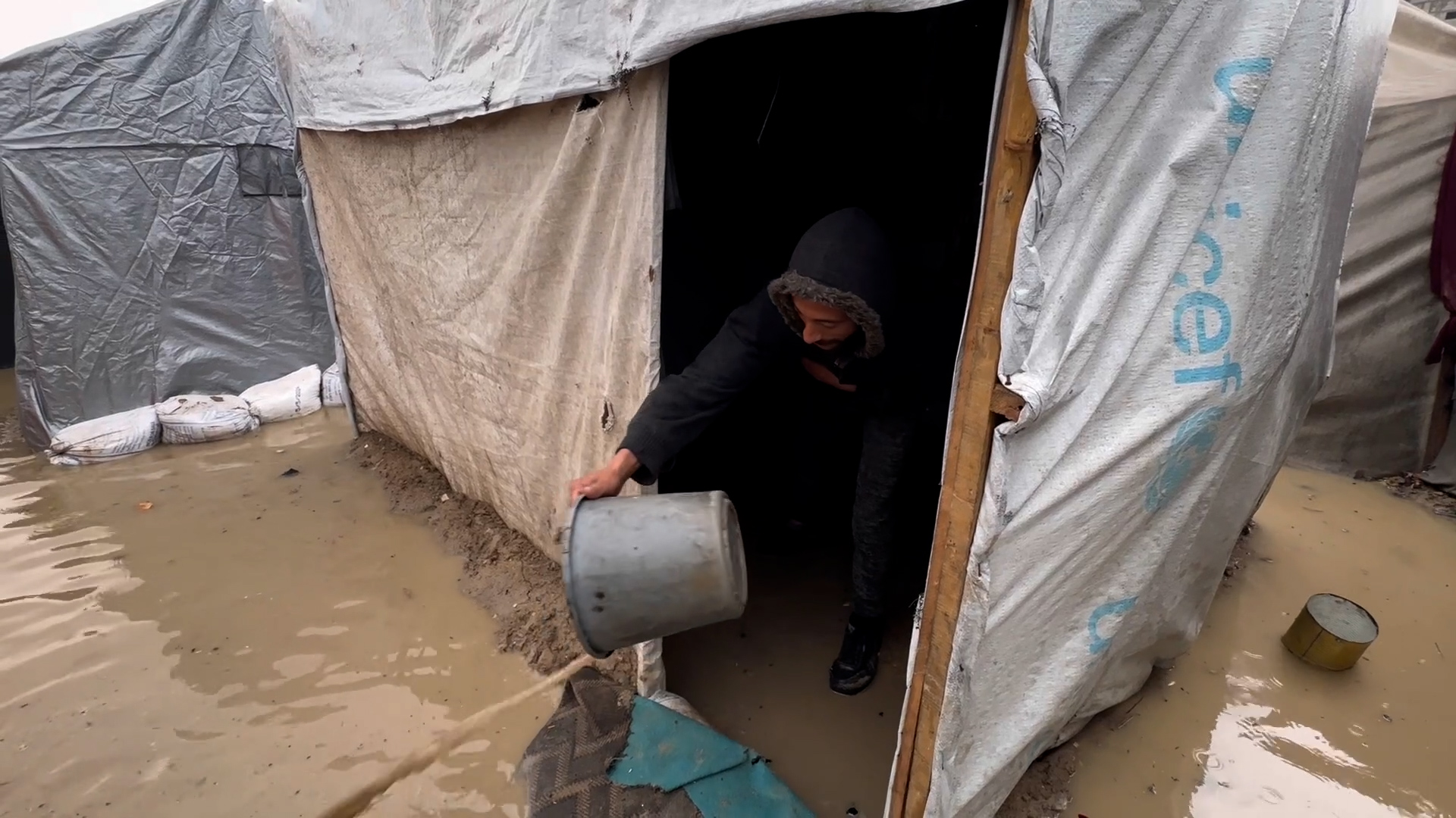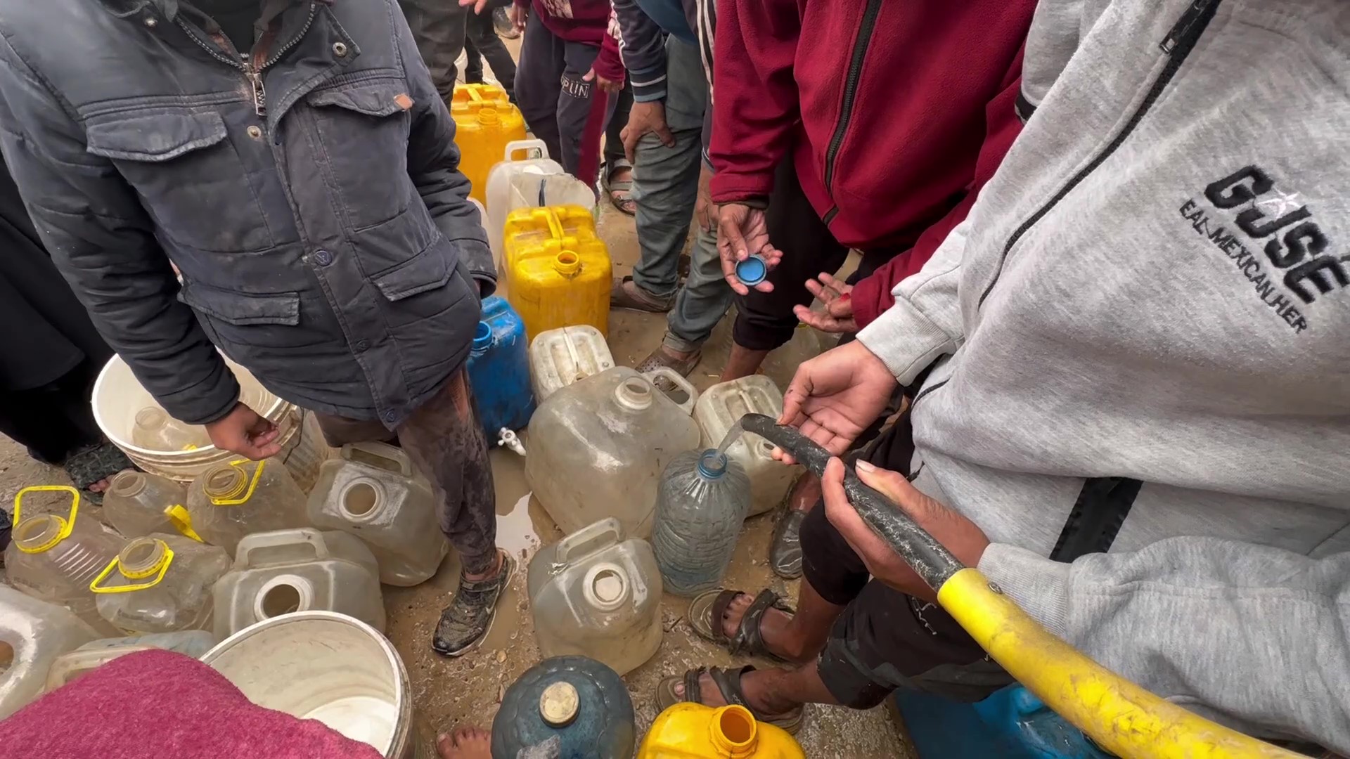 نازحون ينتظرون تحت المطر لتعبئة مياه الشرب