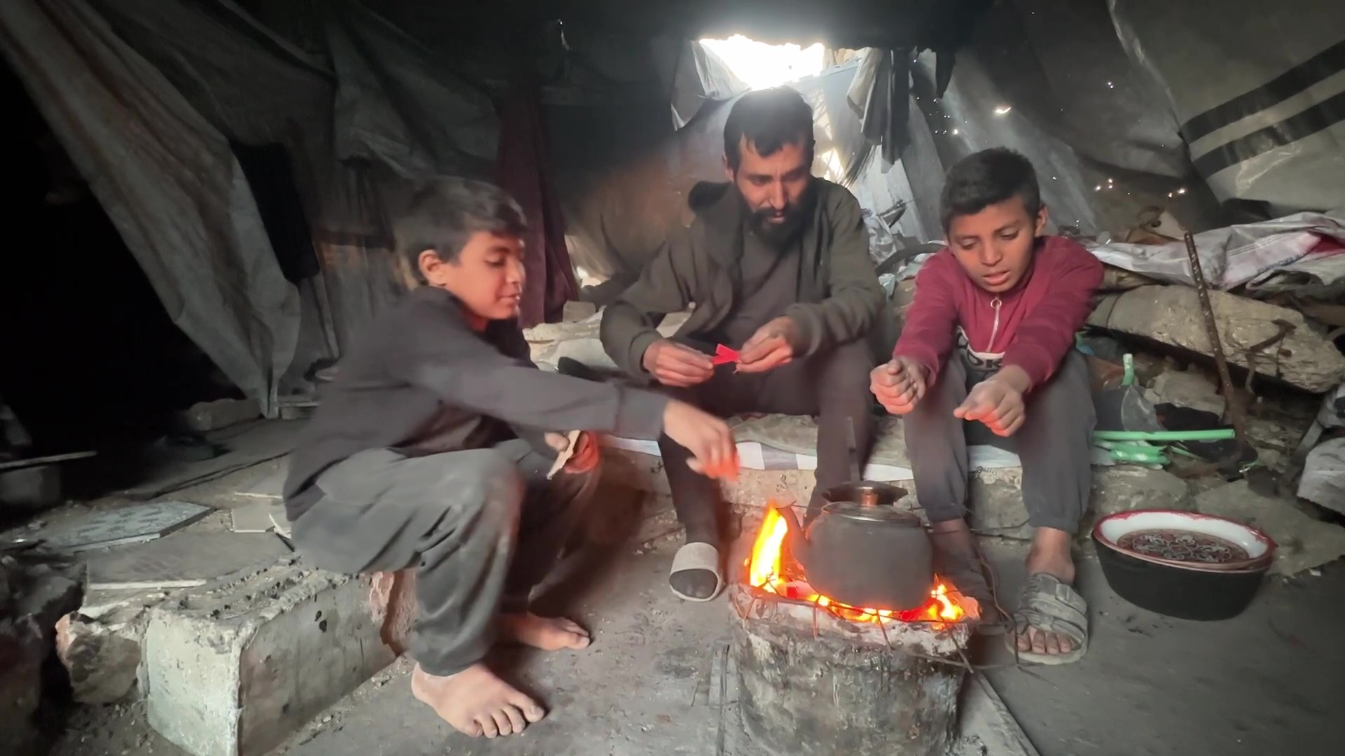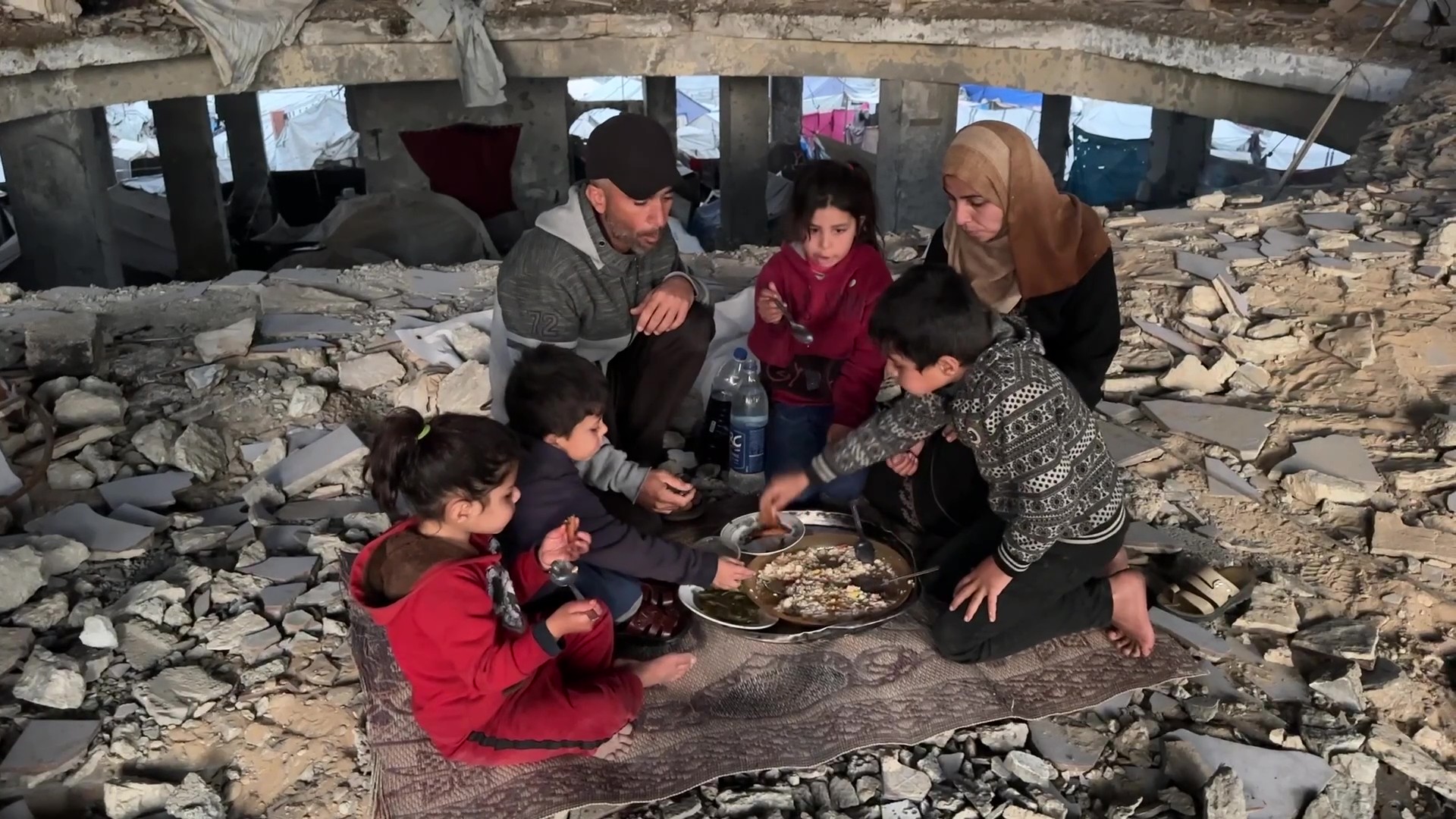 أسرة نازحة تتناول إفطار رمضان على أنقاض مسجد بغزة