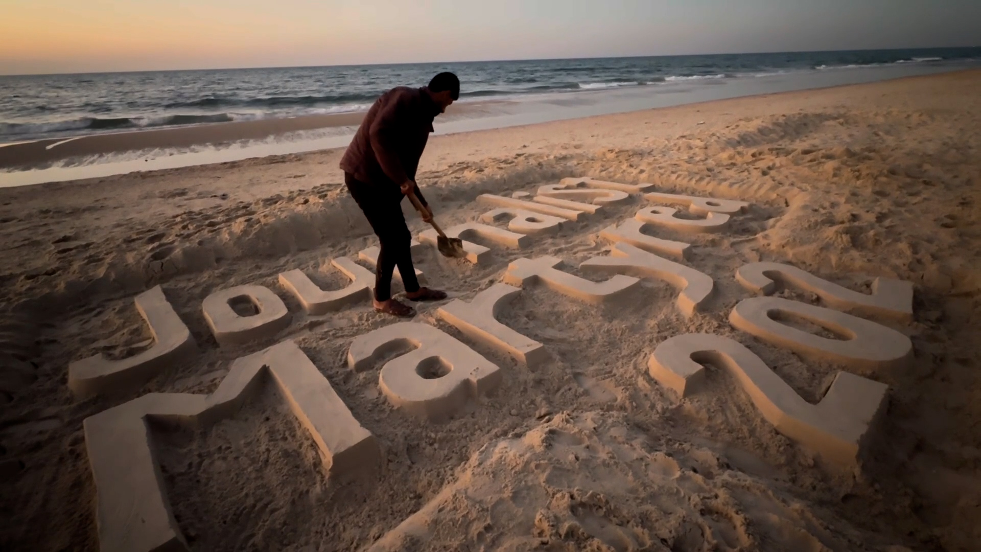 فنان يوثق عدد الشهداء الصحفيين على رمل الزوايدة