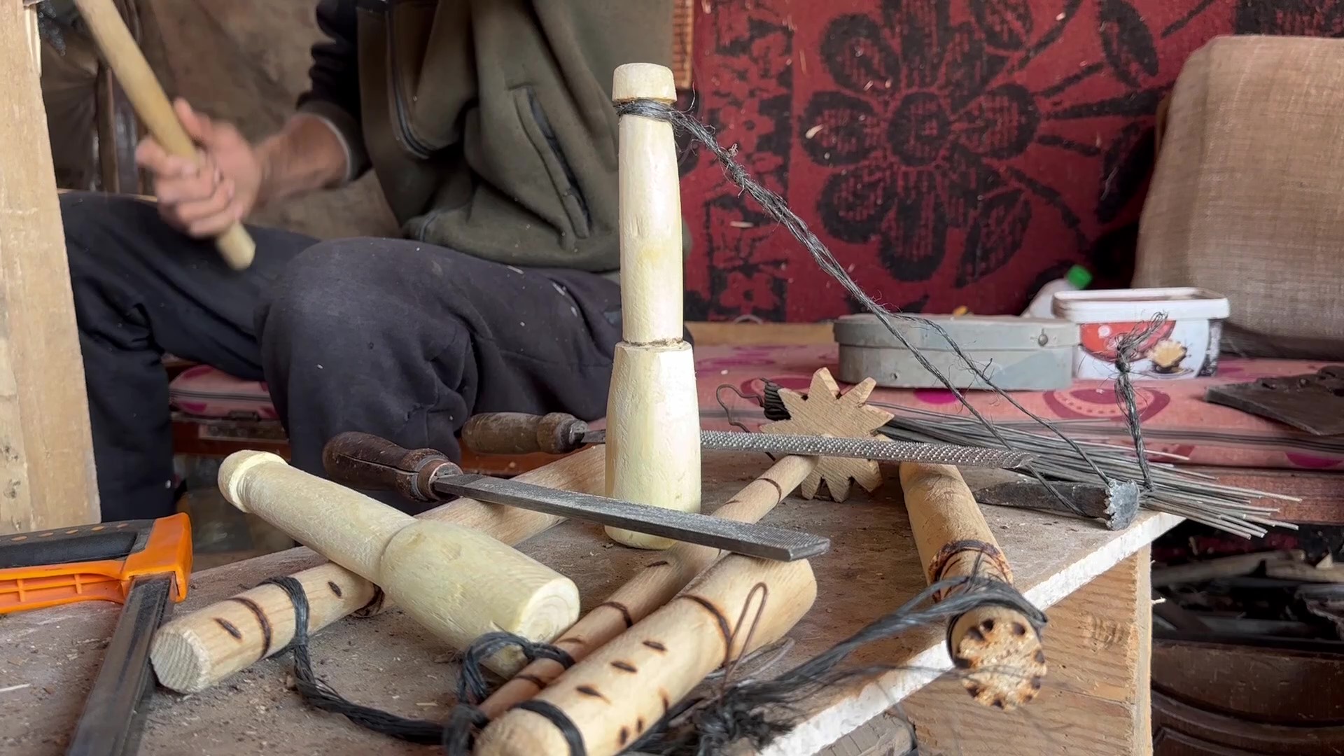 صناعة أدوات منزلية خشبية في خيمة النزوح