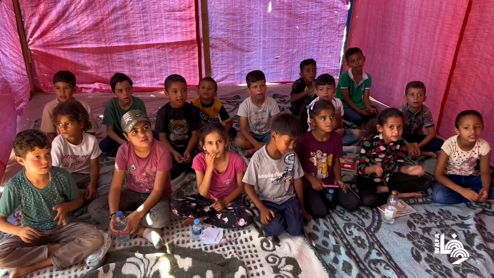 أطفال يتلقون دروساً في خيام النزوح بدير البلح