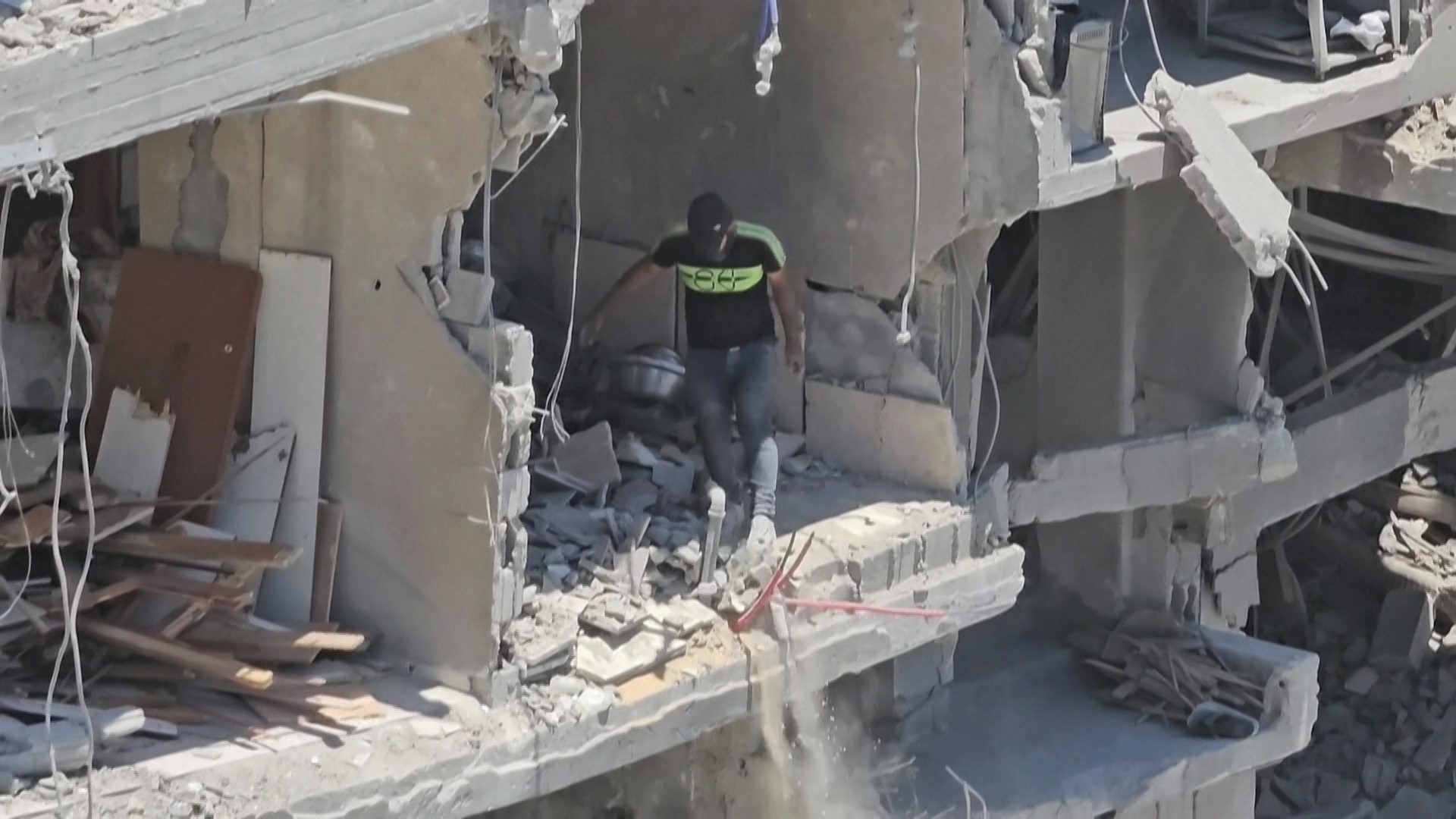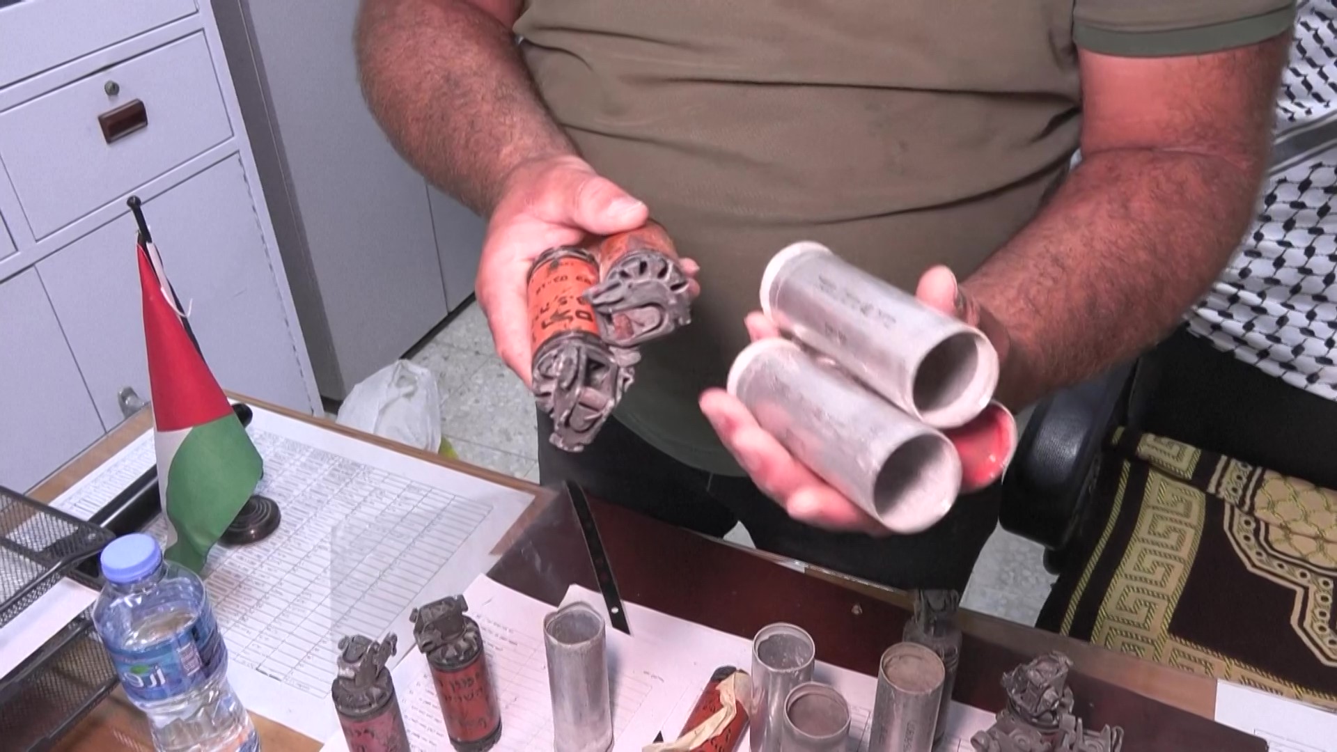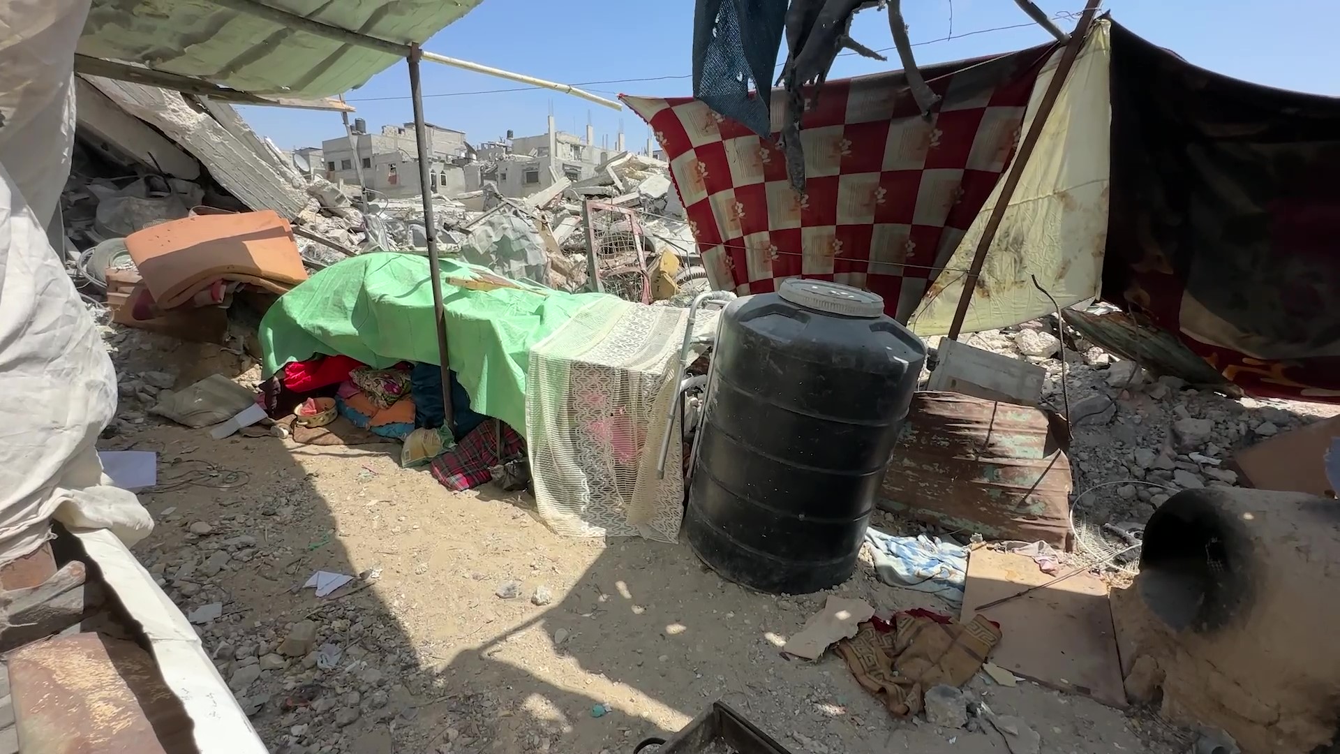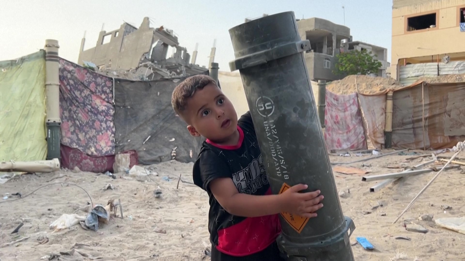 نازح يبني خيمة من مخلّفات الذخائر الإسرائيلية