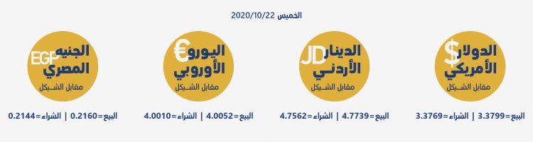 رام الله 22-10-2020 وفا- جاءت أسعار العملات مقابل الشيقل الإسرائيلي، اليوم الخميس، حسب سلطة النقد، على النحو التالي: