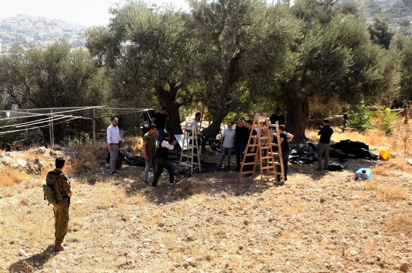 اقنيبي ينتظر سماح سلطات الاحتلال التي منعته من اكمال قطاف الزيتون في أرضه التي تبلغ ثلاثة دونمات ونصف، مزروعة بأربعين شجرة زيتون رومية يقدر عمرها بـ2400 عام.