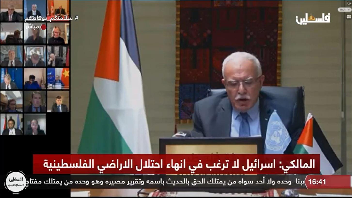 وأكد المالكي أن إسرائيل قررت تحت الضغط فقط، تجميد خططها غير القانونية للضم الرسمي لمناطق خارج مدينة القدس الشرقية المحتلة، لكنها لم تتخلى عن سياستها المستمرة منذ عقود والتي تهدف إلى السيطرة على أكبر مساحة من الأراضي الفلسطينية مع الحد الأدنى من الفلسطينيين، وبعبارة أخرى الحد الأقصى من الجغرافيا الفلسطينية مع الحد الأدنى من الديموغرافية الفلسطينية، مشيراً الى استمرارها في ضم الأراض بحكم الأمر الواقع بالأيام الأخيرة أعلنت عن بناء 5000 وحدة استيطانية في عمق الضفة الغربية، بما في ذلك داخل القدس الشرقية المحتلة ومحيطها. ودعا الوزير المالكي المجتمع الدولي الى العمل لإنقاذ السلام، وأشار الى ضرورة تلبية دعوة الرئيس محمود عباس لعقد مؤتمر دولي للسلام بحيث يولد الزخم اللازم لحشد المجتمع الدولي ككل لمساعدة الأطراف في التفاوض على اتفاقية سلام من شأنها أن تغير منطقتنا إلى الأبد. وشدد على أن أي شيء آخر يعتبر عديم الجدوى، وطالما أن إسرائيل لا تتحمل تكلفة الاحتلال، وتستمر في جني ثمارها، فإنها لن تتفاوض أبدًا بحسن نية.