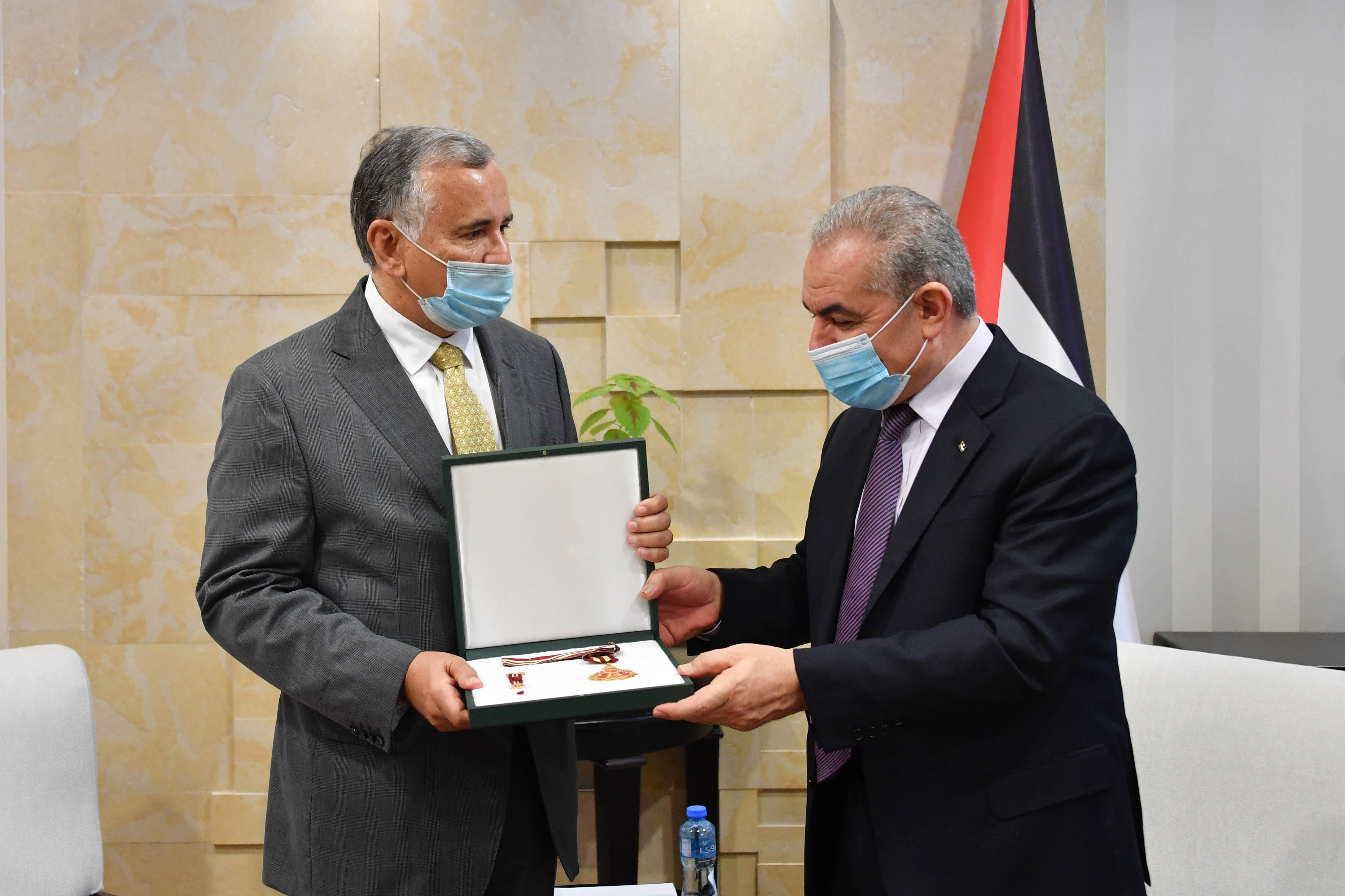 رام الله 28-10-2020 وفا- قلّد رئيس الوزراء محمد اشتية، نيابة عن الرئيس محمود عباس، سفير البرازيل لدى دولة فلسطين فرانسيسكو ماورو أولند، "نجمة القدس" من وسام القدس.