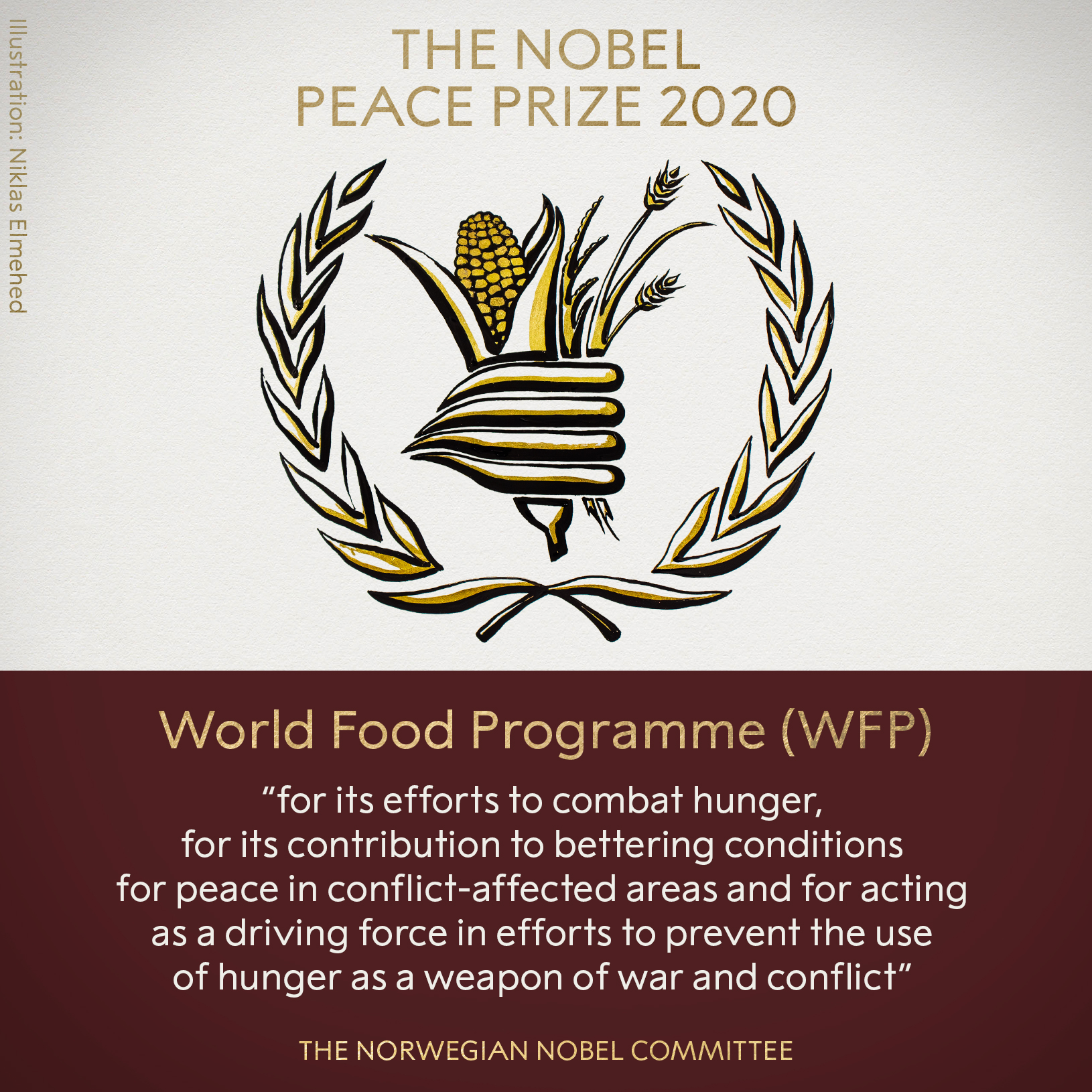 أوسلو 9-10-2020 وفا- فاز برنامج الغذاء العالمي، التابع للأمم المتحدة الجمعة بجائزة نوبل للسلام لعام 2020، لجهوده في مكافحة الجوع حول العالم.