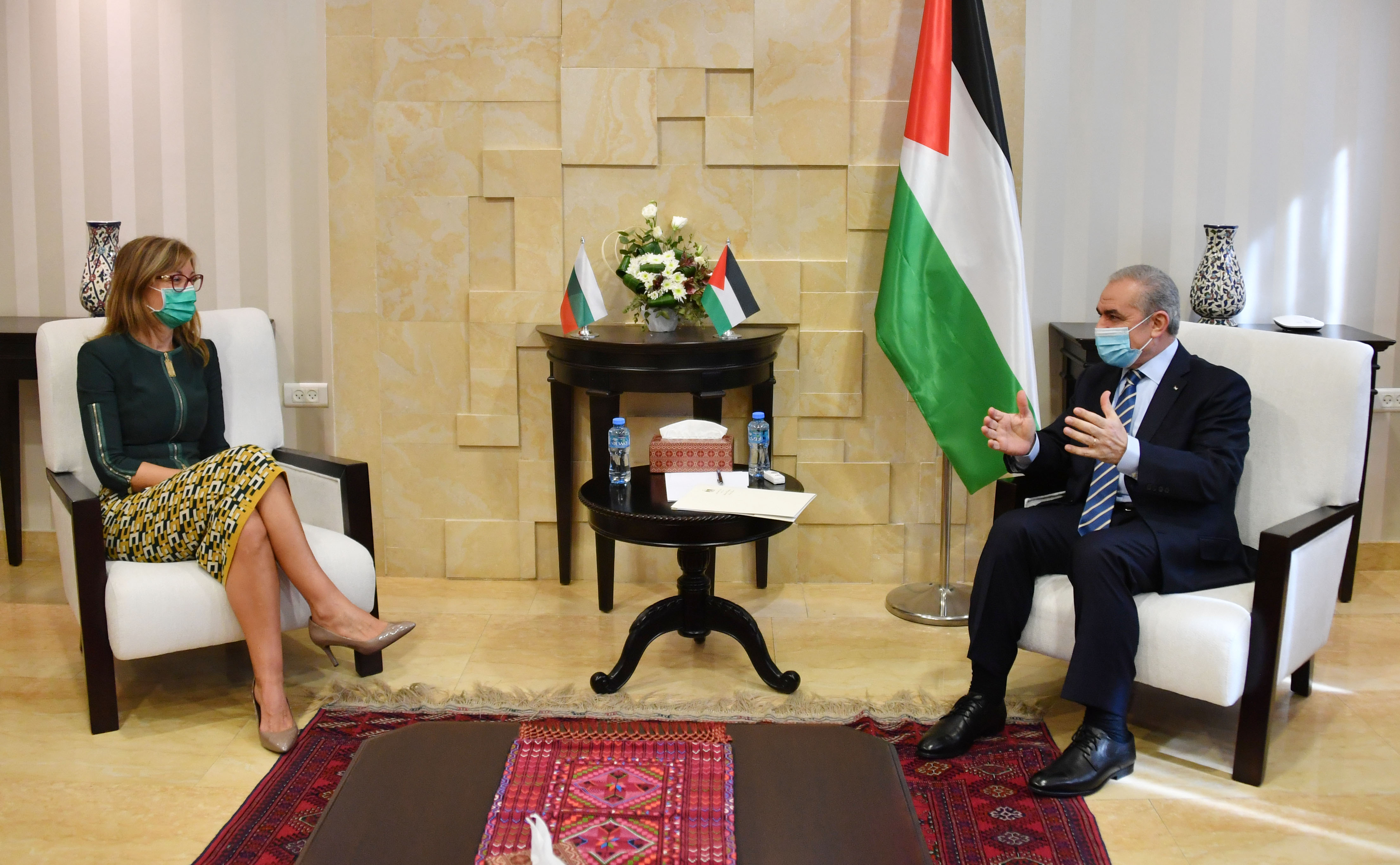 رام الله 13-11-2020 وفا- بحث رئيس الوزراء محمد اشتية، مع نائب رئيس الوزراء البلغاري، وزيرة الخارجية ايكاترينا زاهاريفا، العلاقات الثنائية وآخر المستجدات السياسية.