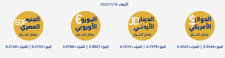 رام الله 18-11-2020 وفا- جاءت أسعار العملات مقابل الشيقل الإسرائيلي، اليوم الأربعاء، حسب سلطة النقد، على النحو التالي: