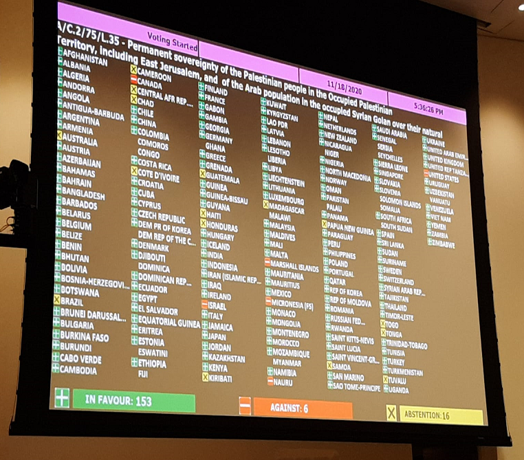 واعتمد القرار بواقع 153 صوتا لصالح القرار، فيما عارضته ست دول (أمريكا، وإسرائيل، وكندا، وونيرو، وميكرونيزيا، وجزر مارشال)، وامتنعت 16 دولة عن التصويت.