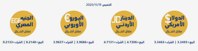 رام الله 19-11-2020 وفا- جاءت أسعار العملات مقابل الشيقل الإسرائيلي، اليوم الخميس، حسب سلطة النقد، على النحو التالي:
