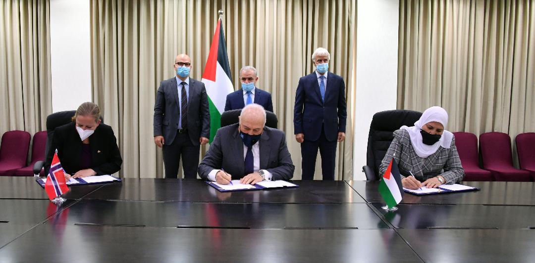 ووقع الاتفاقيات في مكتب رئيس الوزراء برام الله، مع ممثلة النرويج لدى فلسطين تورن فيزتي، وزير التربية والتعليم مروان عورتاني، ووزيرة المرأة آمال حمد، ووزير المالية شكري بشارة، ونائب رئيس بعثة UNDP لدى فلسطين تشيتوس نوجوشي، بحضور وزير القدس فادي الهدمي.