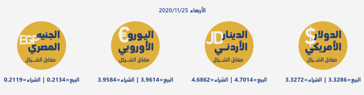 رام الله 25-11-2020 وفا- جاءت أسعار العملات مقابل الشيقل الإسرائيلي، اليوم الأربعاء، حسب سلطة النقد، على النحو التالي: