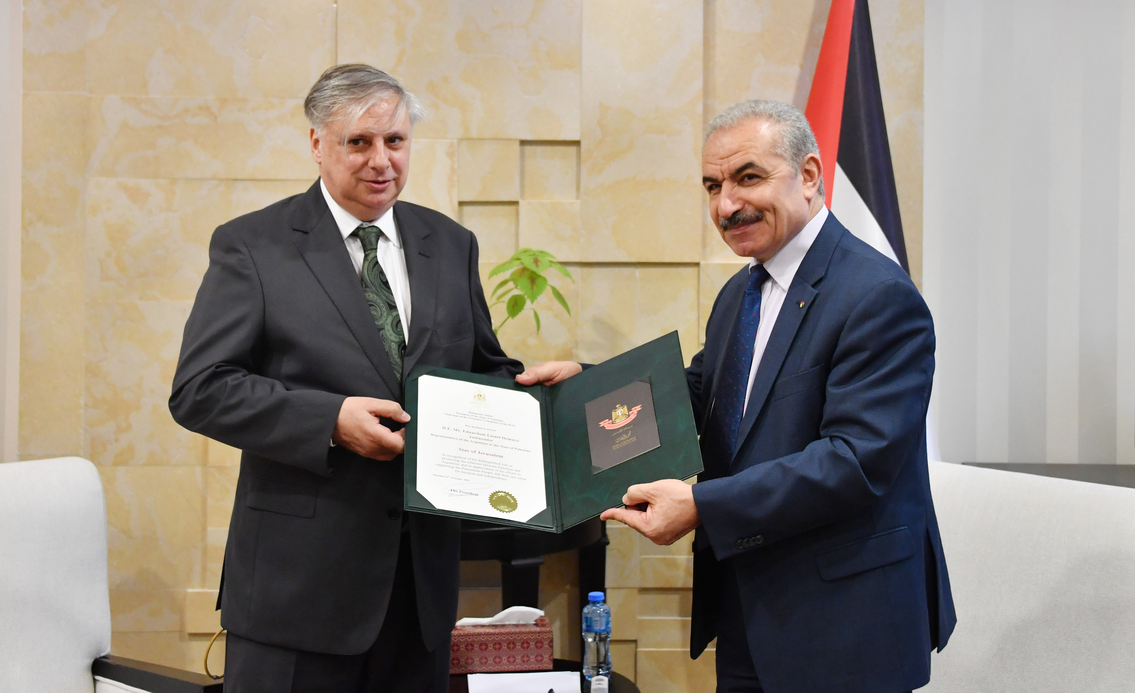 رام الله 11-3-2020 وفا- قلّد رئيس الوزراء محمد اشتية، نيابة عن الرئيس محمود عباس، رئيس مكتب تمثيل جمهورية الأرجنتين إدواردو دي مايو، "نجمة القدس" من وسام القدس.