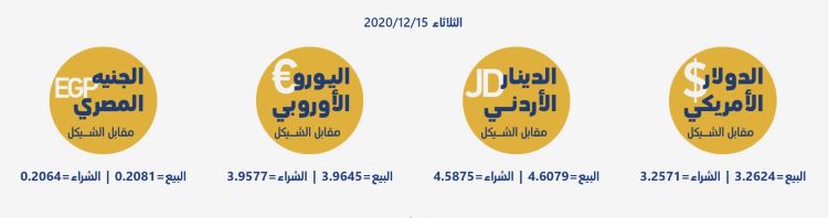 رام الله 15-12-2020 وفا- جاءت أسعار العملات مقابل الشيقل الإسرائيلي، اليوم الثلاثاء، حسب سلطة النقد، على النحو التالي: