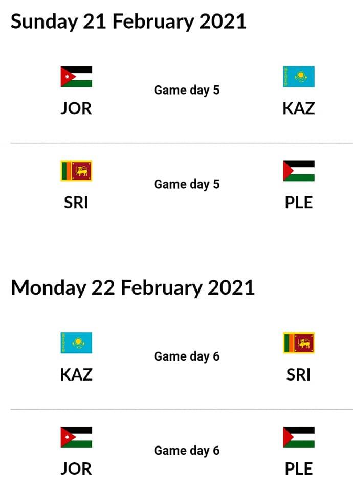 واعتمد الاتحاد الآسيوي العاصمة البحرينية المنامة لمجموعة منتخبنا السلوى "الأردن، كازخستان، سيرلانكا وفلسطين"، ولعبت هذه المجموعة سابقا، بحيث لعب كل منتخب مباراتين ليتصدر منتخب الأردن الترتيب 4 نقاط ثم كازخستان 3 نقاط في المركز الثاني، وفلسطين في المركز الثالث برصيد 3 نقاط وأخيرا سيرلانكا برصيد نقطتين.