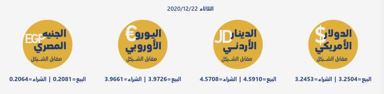 رام الله 22-12-2020 وفا- جاءت أسعار العملات مقابل الشيقل الإسرائيلي، اليوم الثلاثاء، حسب سلطة النقد، على النحو التالي: