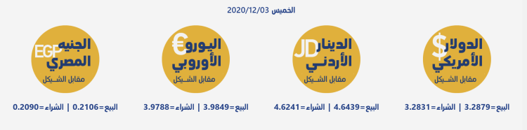 رام الله 3-12-2020 وفا- جاءت أسعار العملات مقابل الشيقل الإسرائيلي، اليوم الخميس، حسب سلطة النقد، على النحو التالي: