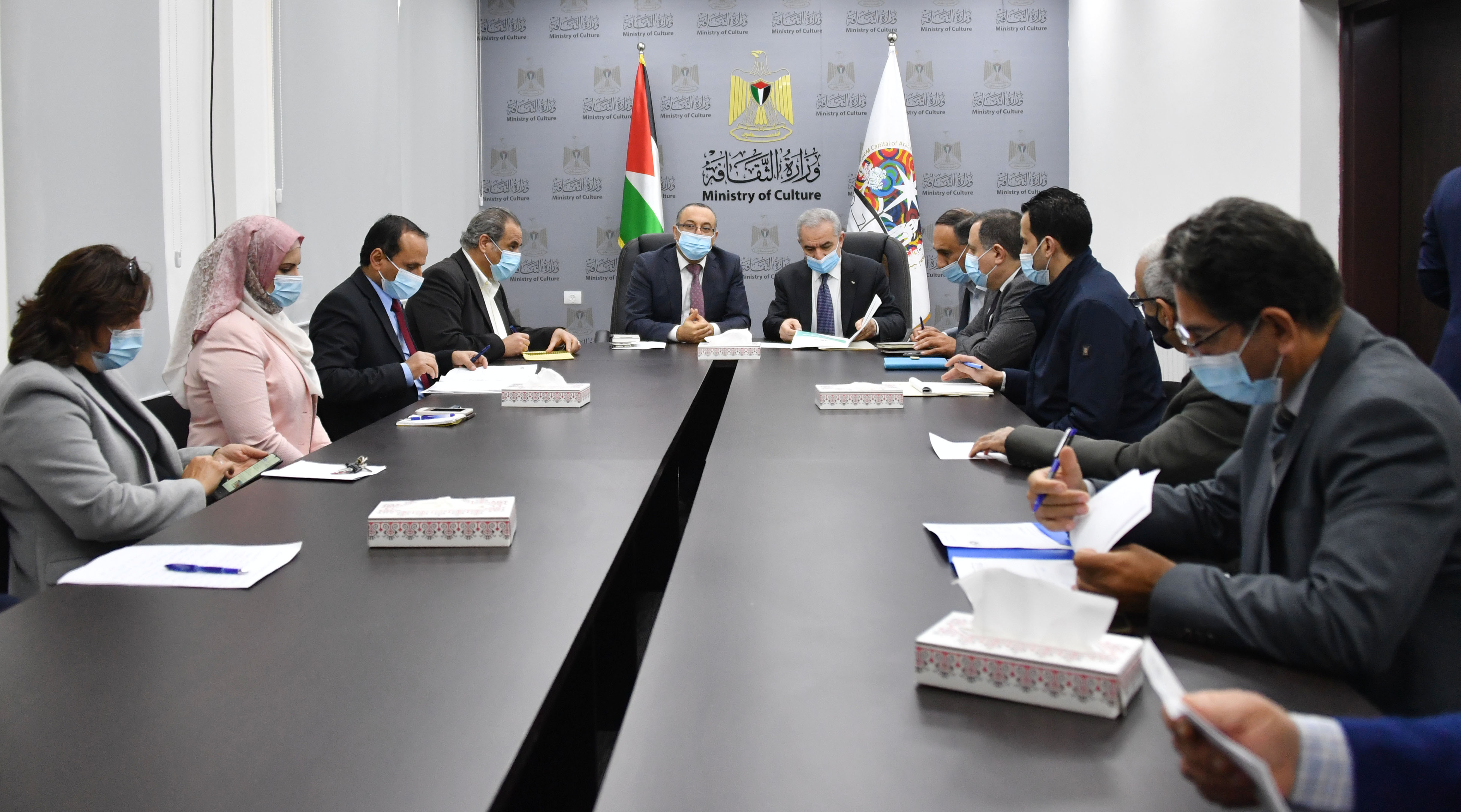 رام الله 30-12-2020 وفا- تفقد رئيس الوزراء محمد اشتية، اليوم الأربعاء، وزارة الثقافة في رام الله، والتقى بالوزير عاطف أبو سيف والمدراء العامين.