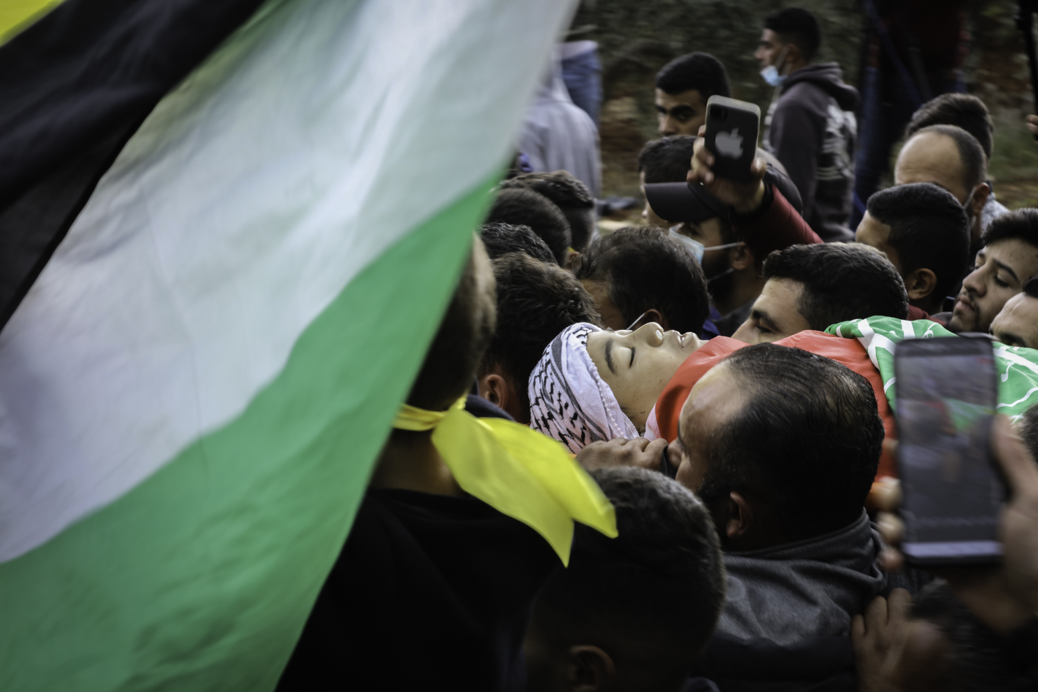 فجأة يقف جده، الذي خر باكيا منهارا لحظة وصول الجثمان إلى البيت ويقول لابنه:" ارفع راسك يابا.. ابنك شهيد".