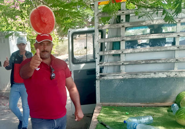واقفان يرتديان زيهما الأحمر الفاقع والتقليدي، يرفع كل منهما 3 بطيخات فوق رأسه، وفوقها علم فلسطين، يتحركان ويرقصان ويناديان دون أن تهتز واحدة من تلك البطيخات التي فوق رأسهما.