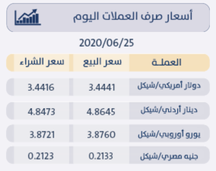 رام الله  25-6-2020 وفا- جاءت أسعار العملات مقابل الشيقل الإسرائيلي، اليوم الخميس، حسب سلطة النقد، على النحو التالي: