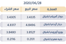 رام الله 28-6-2020 وفا- جاءت أسعار العملات مقابل الشيقل الإسرائيلي، اليوم الأحد، حسب سلطة النقد، على النحو التالي:
