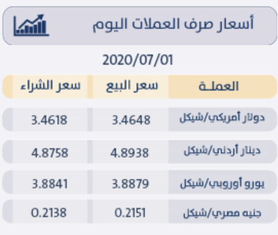 رام الله 1-7-2020 وفا- جاءت أسعار العملات مقابل الشيقل الإسرائيلي، اليوم الأربعاء، حسب سلطة النقد، على النحو التالي: