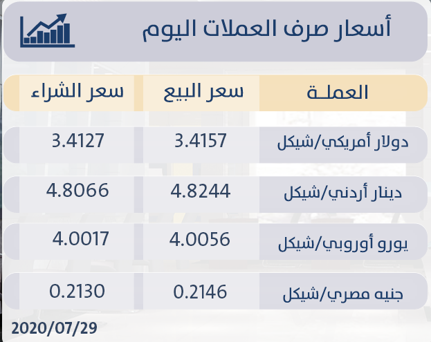 رام الله 29-7-2020 وفا- جاءت أسعار العملات مقابل الشيقل الإسرائيلي، اليوم الأربعاء، حسب سلطة النقد، على النحو التالي: