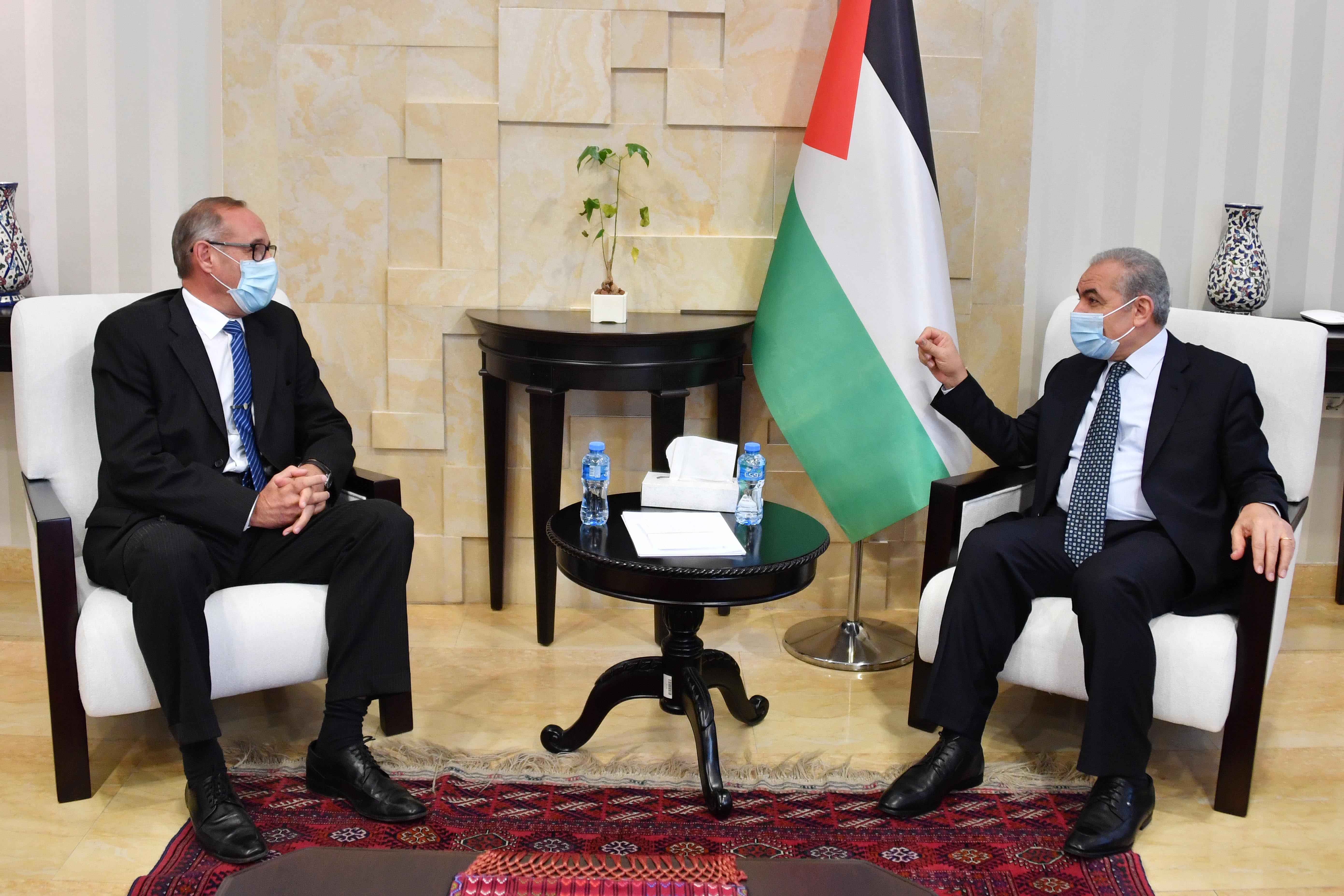 رام الله 29-7-2020 وفا- استقبل رئيس الوزراء محمد اشتية، في مكتبه بمدينة رام الله، اليوم الأربعاء، رئيس البعثة الأوروبية لمساندة الشرطة الفلسطينية كاوكو ألتوما، لمناسبة انتهاء مهامه الرسمية.