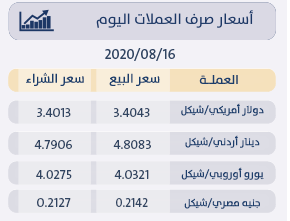 رام الله 16-8-2020 وفا- جاءت أسعار العملات مقابل الشيقل الإسرائيلي، اليوم الأحد، حسب سلطة النقد، على النحو التالي: