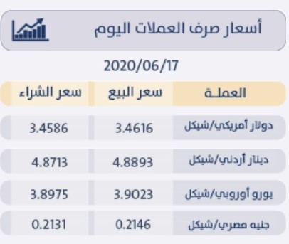 رام الله  17-8-2020 وفا- جاءت أسعار العملات مقابل الشيقل الإسرائيلي، اليوم الإثنين، حسب سلطة النقد، على النحو التالي: