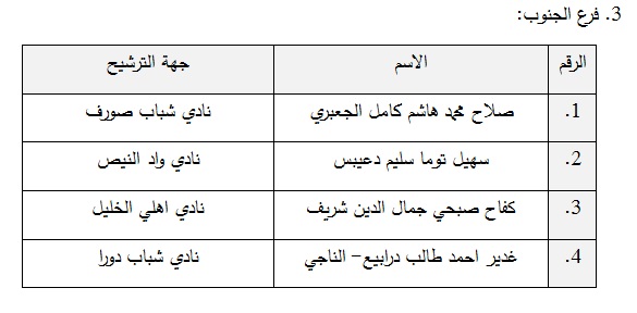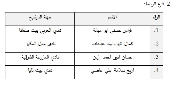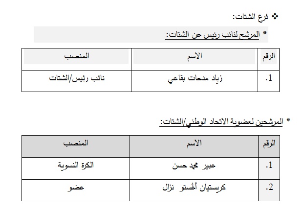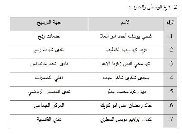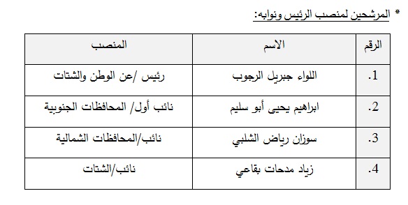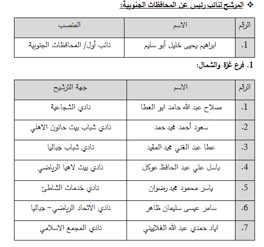 وأكدت الأمانة العامة أن اعلانها لقائمة المرشحين جاء بعد انتهاء لجنة الحوكمة والانتخابات من دراستها وفقاً للمعايير الخاصة بالترشح والمنصوص عليها في النظام الاساسي للاتحاد، مع الاشارة الى أن فترة الطعن والانسحاب تقع خلال الفترة من صباح يوم السبت الموافق 29/8/2020، ولغاية الساعة الثالثة من عصر يوم الاثنين الموافق 31/8/2020، ليتم بعد ذلك الاعلان عن القائمة النهائية للمرشحين، وذلك يوم الخميس الموافق 03/09/2020، وفيما يلي قائمة المرشحين للمكتب التنفيذي للاتحاد الفلسطيني لكرة القدم:
