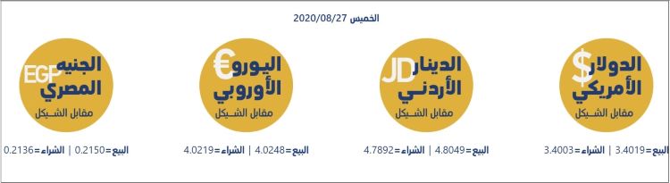 رام الله  27-8-2020 وفا- جاءت أسعار العملات مقابل الشيقل الإسرائيلي، اليوم الخميس، حسب سلطة النقد، على النحو التالي: