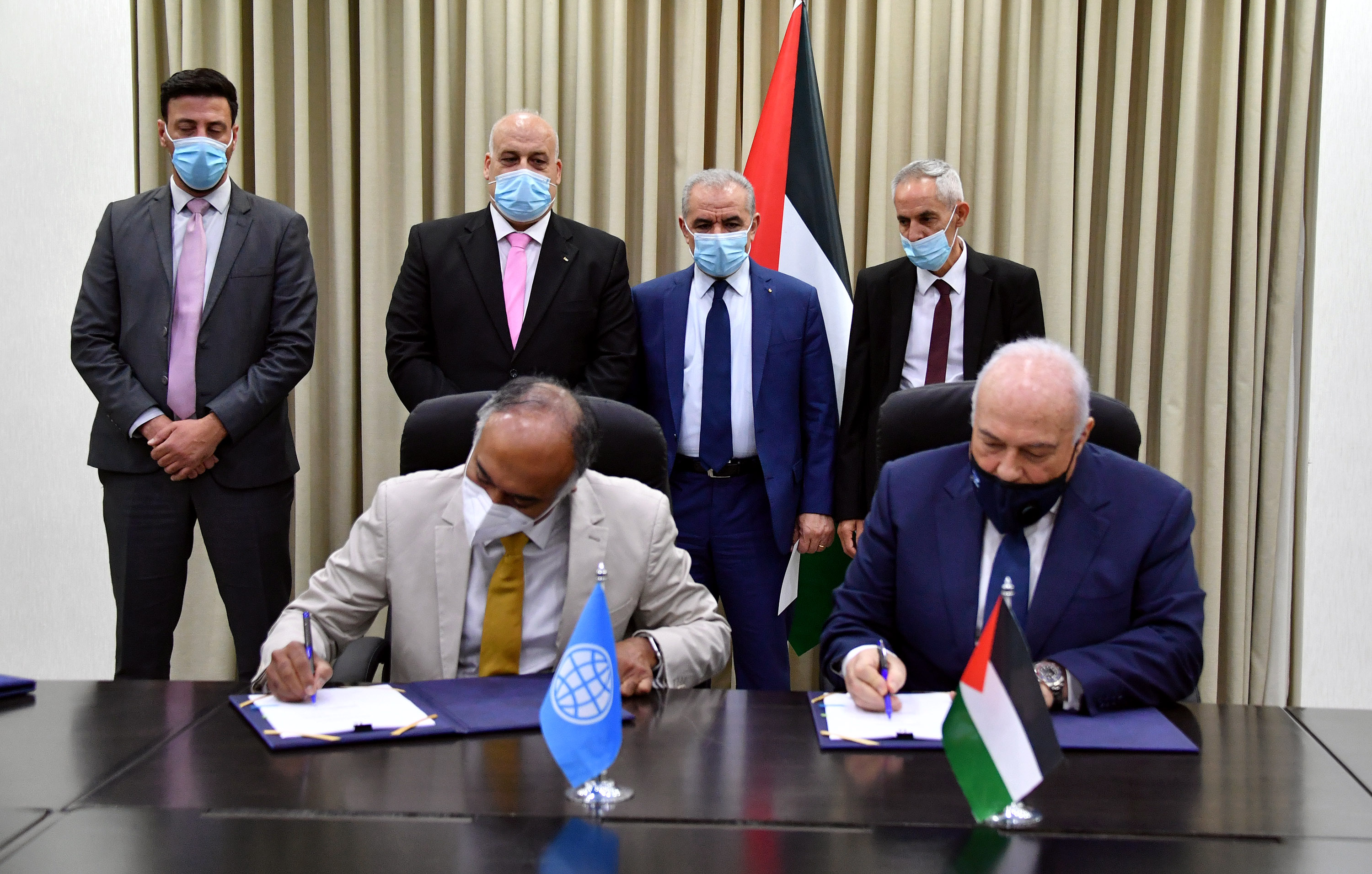 رام الله 6-8-2020 وفا- برعاية وحضور رئيس الوزراء محمد اشتية، وقعت الحكومة ممثلة بوزير المالية شكري بشارة، والبنك الدولي ممثلا بمديره في فلسطين كانثان شانكار، اليوم الخميس، في مكتب رئيس الوزراء برام الله، اتفاقية بقيمة 30 مليون دولار، بحضور وزير العمل نصري أبو جيش، ووكيل وزارة التنمية الاجتماعية داوود الديك، ومدير صندوق التشغيل مهدي حمدان.