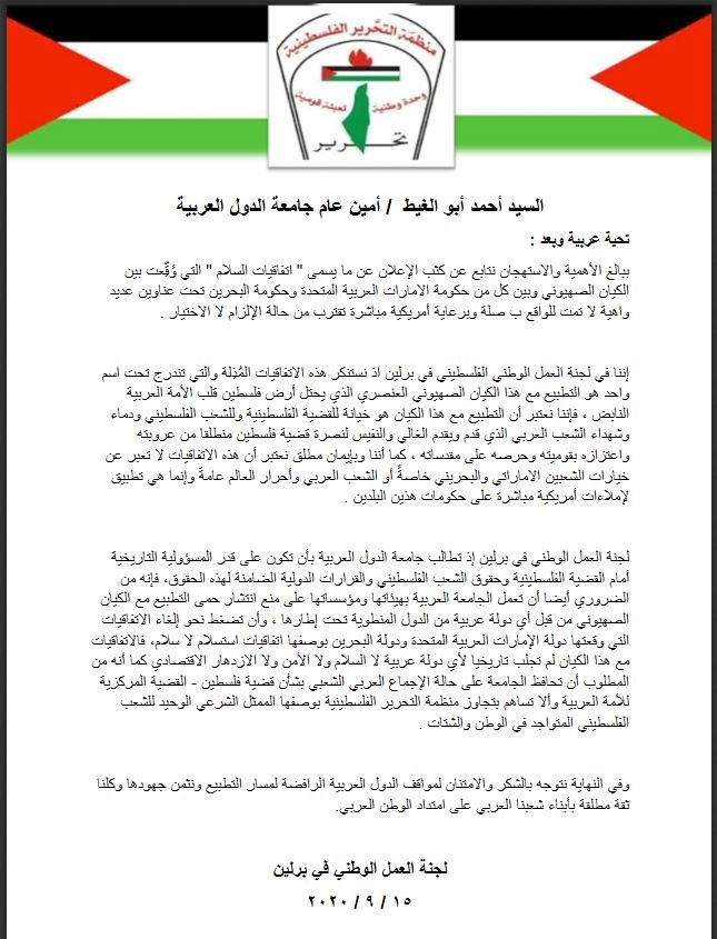 برلين 16-9-2020 وفا- طالبت لجنة العمل الوطني في برلين جامعة الدول العربية بحماية الاجماع العربي ومواجهة التطبيع مع الاحتلال الإسرائيلي.