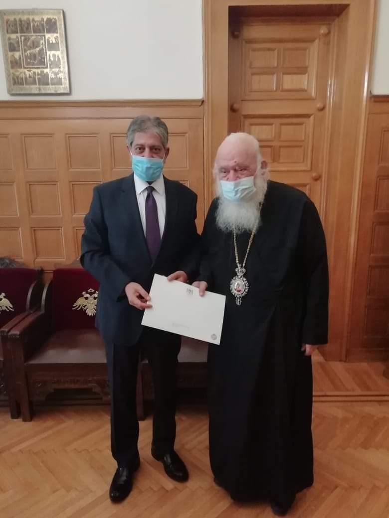 أثينا 20-9-2020 وفا- سلّم سفير دولة فلسطين لدى اليونان مروان طوباسي، رئيس أساقفة أثينا وعموم اليونان ييرونيموس الثاني، رسالة خطية من الرئيس محمود عباس، حول مخاطر استيلاء سلطات الاحتلال على أوقاف وممتلكات بطريركية الروم الارثوذكس في القدس الشرقية.