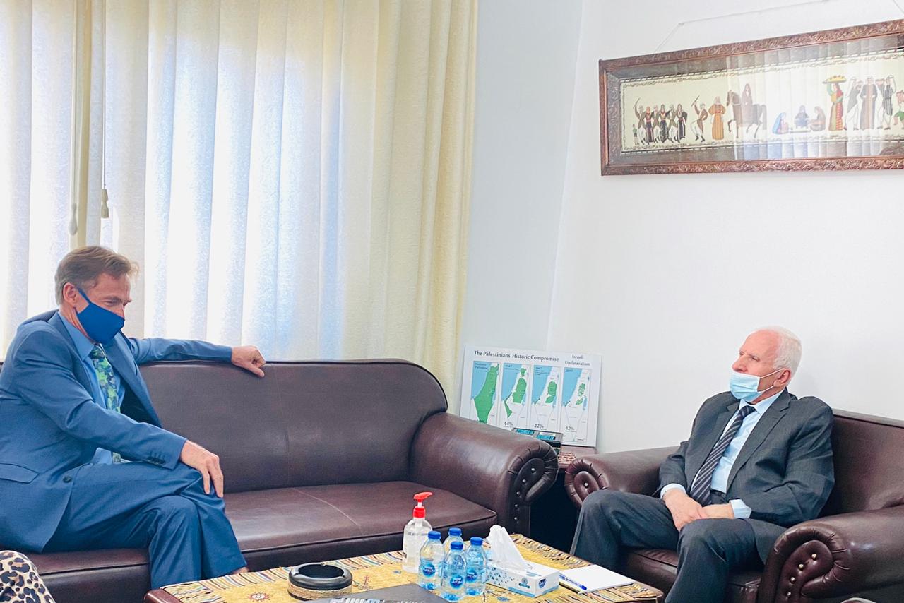 رام الله 29-9-2020 وفا- أطلع عضو اللجنتين التنفيذية لمنظمة التحرير والمركزية لحركة فتح عزام الأحمد، ممثل الاتحاد الأوروبي في فلسطين سفين كون فون بورغسدورف، على آخر التطورات الخاصة بالقضية الفلسطينية في ظل استمرار النشاط الاستيطاني الإسرائيلي، وبناء آلاف الوحدات الاستيطانية في مختلف مناطق الضفة الغربية، وخاصة في القدس والأغوار، ومصادرة الأراضي وهدم المنازل واقتلاع وحرق الأشجار الخاصة بالمزارعيين، ما يؤكد أن حكومة نتنياهو تمارس الخداع على من توهموا من أنظمة التطبيع العربي بأنهم أوقفوا الضم.