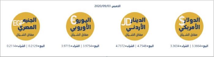 رام الله 3-9-2020 وفا- جاءت أسعار العملات مقابل الشيقل الإسرائيلي، اليوم الخميس، حسب سلطة النقد، على النحو التالي: