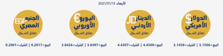 رام الله 13-1-2021 وفا- جاءت أسعار العملات مقابل الشيقل الإسرائيلي، اليوم الأربعاء، حسب سلطة النقد، على النحو التالي: