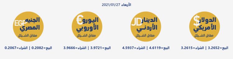 رام الله 27-1-2021 وفا- جاءت أسعار العملات مقابل الشيقل الإسرائيلي، اليوم الأربعاء، حسب سلطة النقد، على النحو التالي: