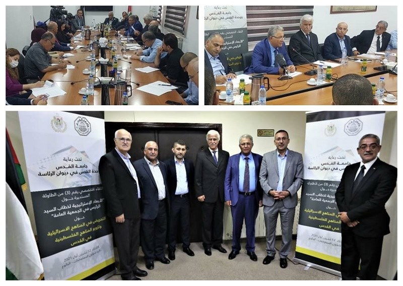 رام الله 12-10-2021 وفا- نظّمت جامعة القدس، ووحدة القدس في الرئاسة، اليوم الثلاثاء، اللقاء الثالث ضمن سلسلة لقاءات الطاولة المستديرة، وجاء حول التحريض في المناهج الإسرائيلية والهجوم الذي تتعرض له المناهج الفلسطينية.