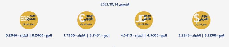 رام الله 14-10-2021 وفا- جاءت أسعار العملات مقابل الشيقل الإسرائيلي، اليوم الخميس، حسب سلطة النقد، على النحو التالي: